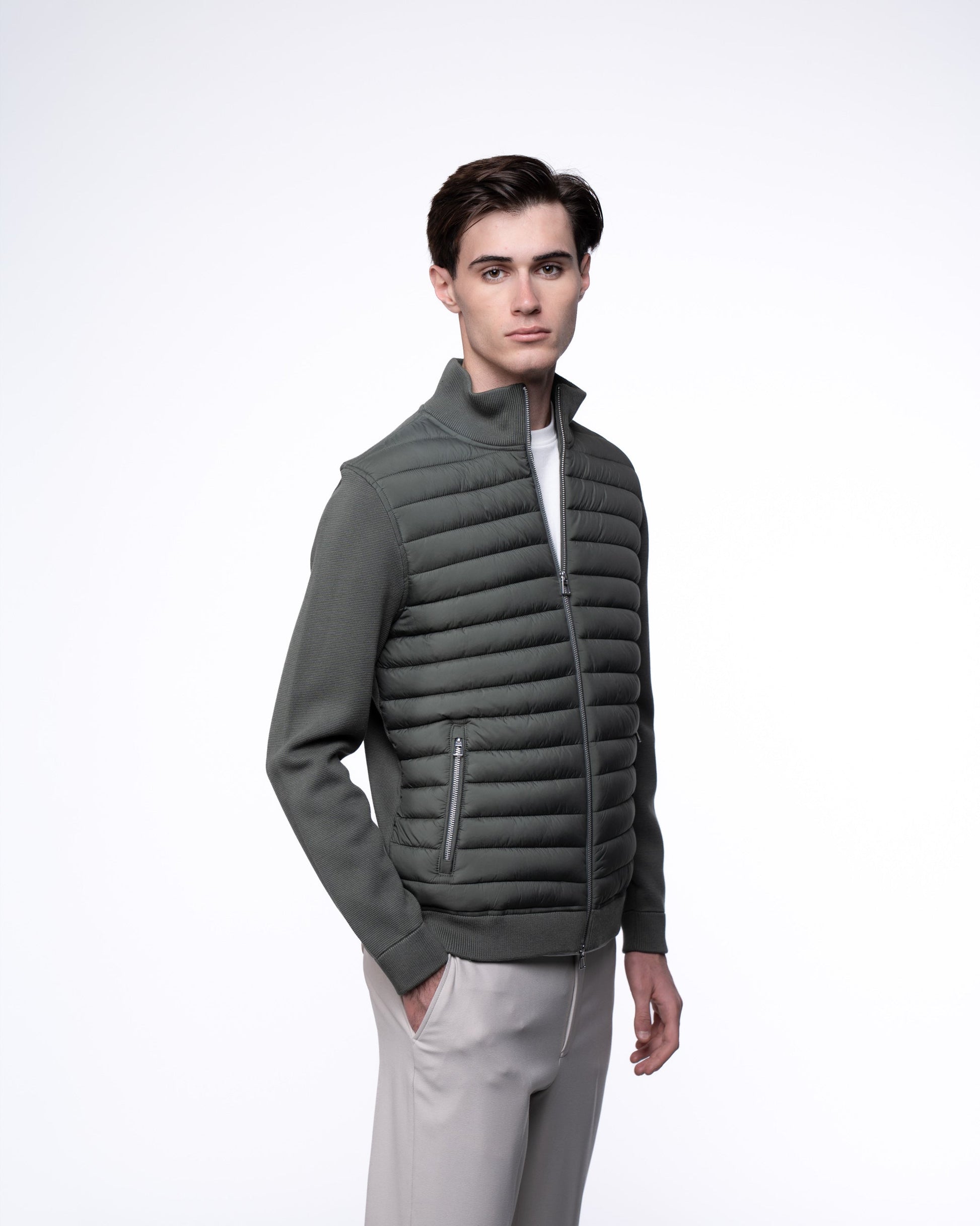 Ten oliwkowy model to idealna alternatywa dla klasycznej czerni. Łączy w sobie surowy, męski charakter z niezrównanym komfortem. Pikowany korpus chroni przed chłodem, a miękkie, dzianinowe rękawy zapewniają pełną swobodę noszenia.